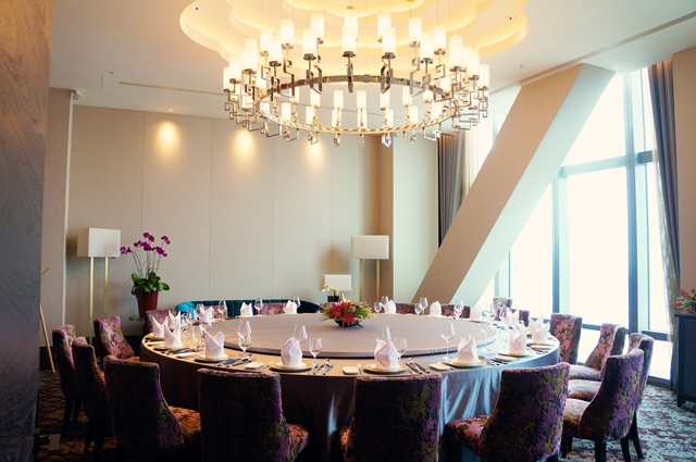 大片落地玻璃窗,桌上的鮮花綠意,紫紅色緞面餐椅,貴氣又高雅。