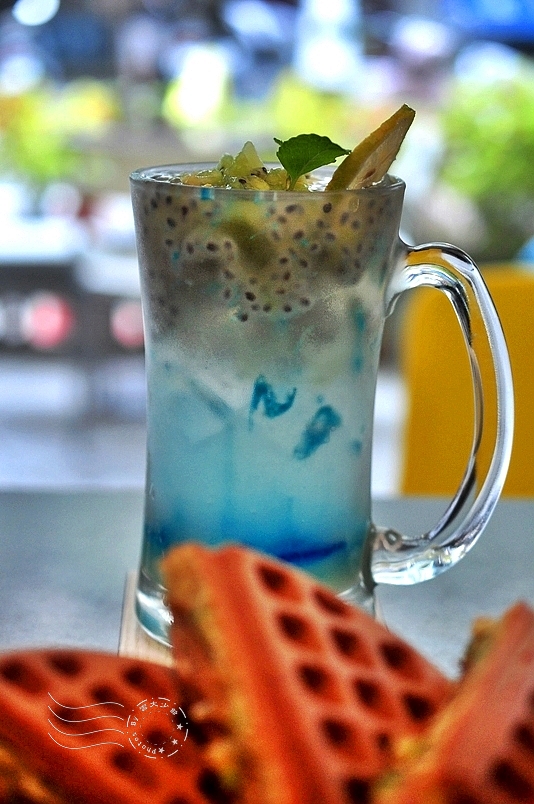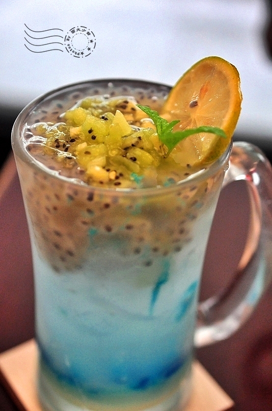 氣泡水中調了檸檬汁、乳酸菌和藍甘菊糖漿,杯口浮著蘭香籽(山粉圓)和奇異果丁,酸酸甜甜,喝了真的感覺能量滿分哩!