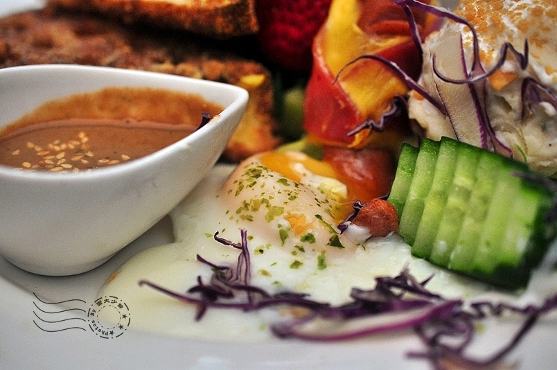 ↓芝麻醬可用來淋沙拉。吃掉外層,裡頭還藏著一顆一碰會流蛋汁的水波蛋!