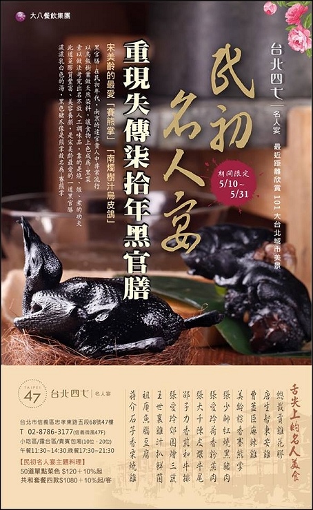 位於微風信義頂樓的台北47名人宴,擁有超近距離的台北101無敵景觀,從新加坡挖角的廚界教父黃清標主廚,非常注重保留中式菜餚的傳統精神,除了招牌的台北47譚府宴之外,最近又推出了期間限定的民初名人宴~黑官膳,單點養生菜色多達50道,最便宜120元起,而套餐有四種選擇,1080元起即可一嚐民初孫中山、宋美齡、張大千、張學良和張愛玲等名人美食。