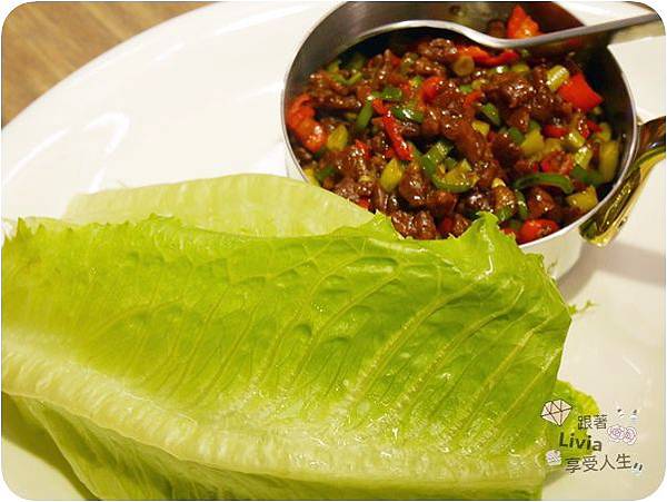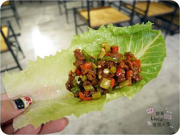 剁椒牛兒末的牛肉稍微有一點辣,包在生菜裡面吃起來,不會油膩很清爽。