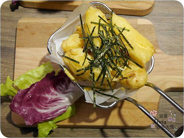 金沙絲襪美人腿,茭白筍切塊之後,沾粉下鍋油炸,外層沾有一點鹽蛋黃,