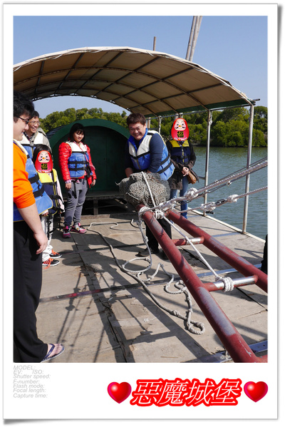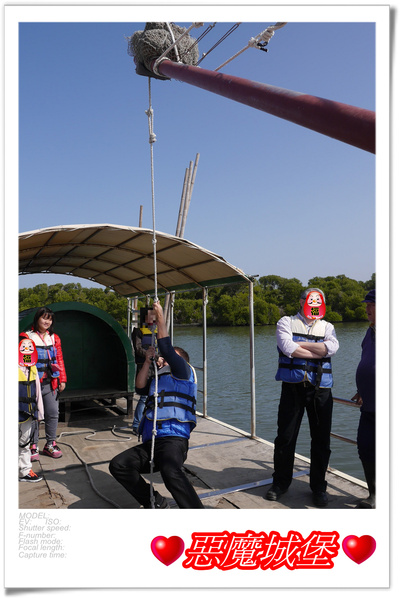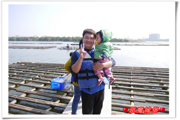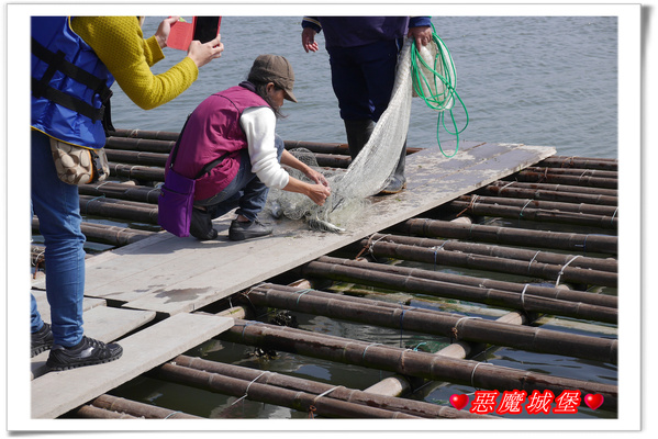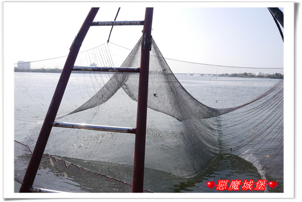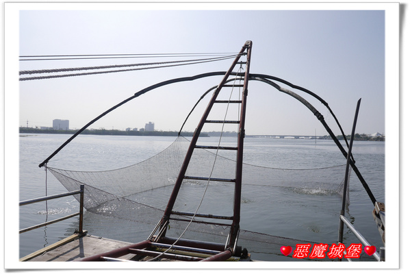 最後導覽員說要挑一個感覺比較有力的人士來挑戰獨自拉「吊罾」,一挑就挑中我們家爸爸,看他用盡力氣狂拉繩子,終於不負眾望的挑戰成功了,船長還開玩笑說以後沒有工作可以來捕魚啦!呵呵!