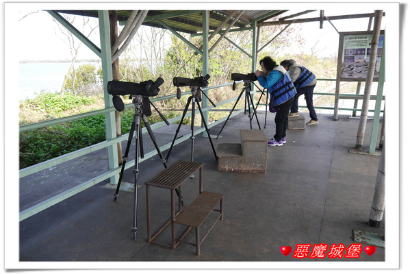 賞鳥平台上放了5架望遠鏡,可以清楚的望見遠處鳥兒活動情形,我只記得好像有水鳥跟白鷺絲,其他名稱都忘記了,哈哈,仔細瞧瞧牠們俏皮的玩水模樣,還真是可愛呢!