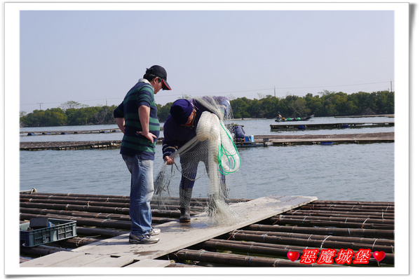 一開始沒有馬上看蚵仔,船長先表演如何撒網捕魚,我發現漁網原來這麼大,而且光把漁網收好就挺難的,更別說想把它好好的拋出去了,所謂隔行如隔山,當漁夫還真的是不簡單哩!