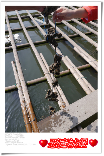 來到蚵棚當然一定要觀賞一下蚵仔,導覽員剖了一個蚵仔給大家欣賞,吃過很多次蚵仔,雖然知道牠是生物,但是從沒想過牠也有心跳,導覽員指出蚵仔的心跳給我們看的時候,看到那小小的努力跳動,突然覺得自己吃蚵仔好像很殘忍.....