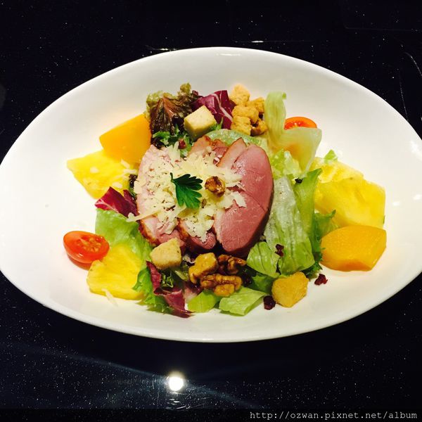 以燻鴨肉為主,搭配生菜、水果、堅果,豐富的色澤,口感清爽。
