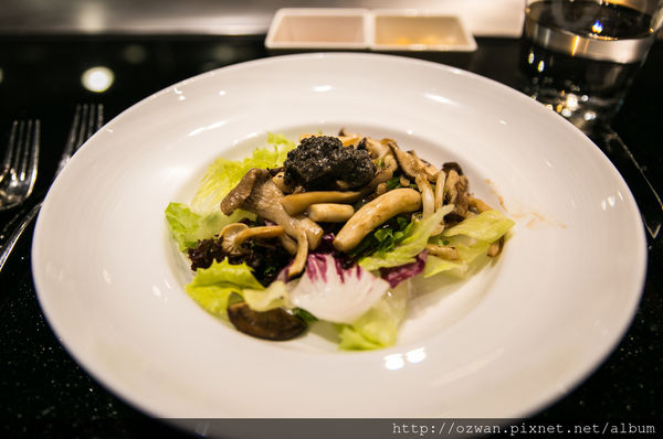 炒熱的菇舖放在生菜上頭,加上松露橄欖油醬汁,營養價值高!