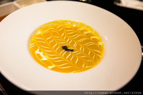 以新鮮南瓜與鮮奶油一起熬製的濃湯,有美麗的拉花,再以黑松露醬點綴。