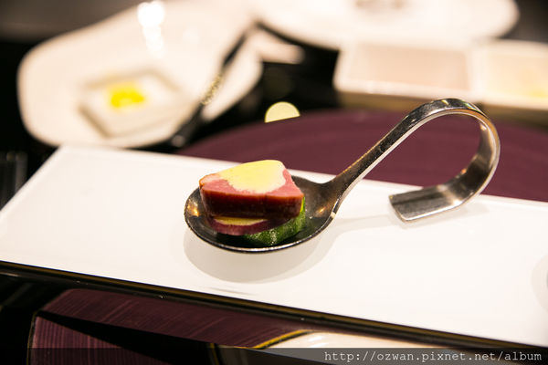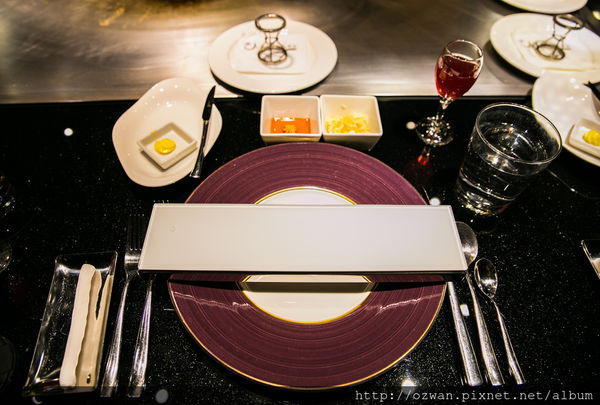 橫放在盤子上方的是開胃菜盤,服務人員會依序將開胃菜擺上去,