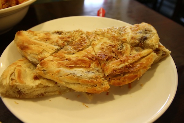 帕米爾比較有特色的是有新疆的饢,饢在台灣挺少見的,其實也就是餅。肉饢即是裡頭包了羊肉的餅,同樣地也有頗重的羊羶味,這饢吃起來比較像是台灣的酥餅,層層酥脆,裡頭的羊肉餡料口感不太明顯,乍吃之下,彷彿沒什麼肉的口感。不過吃著吃著,倒是挺香。