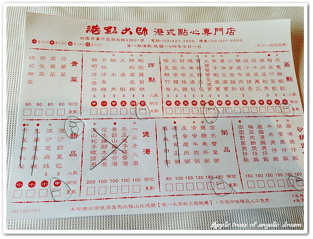 menu,大項分為蒸點、炸點、青菜、砂鍋、粥品、煲湯、甜點,價位80~150元