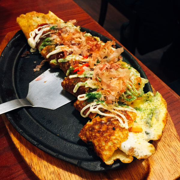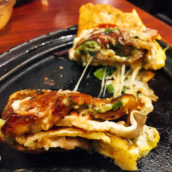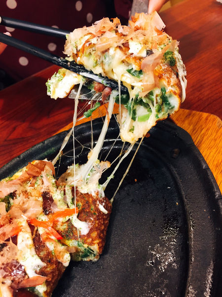 一上桌的時候有點被他的份量給嚇到,超大超澎湃啊!煎過的黃金蛋皮包覆上大量蔥花、麻糬、起司和豬肉片,上頭再灑上柴魚片與海苔粉並淋上美奶滋與日式大板燒醬,吃起來是富有層次感的,有點像台式蚵仔煎偏脆的外皮,蔥抓餅的口感,但是其實是日式大板燒的感覺!
