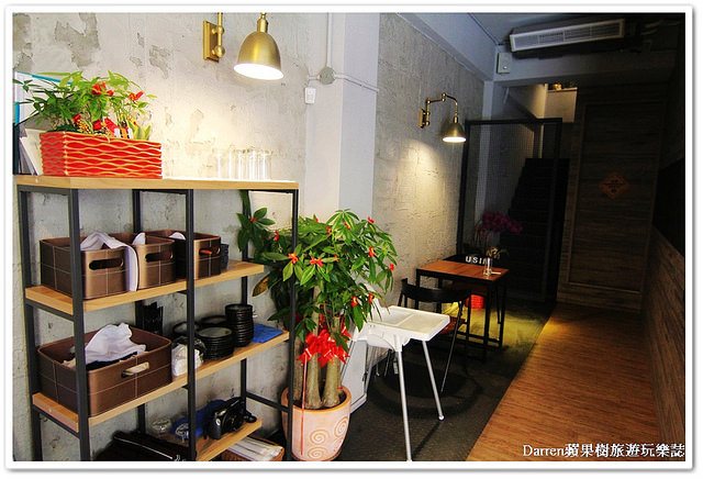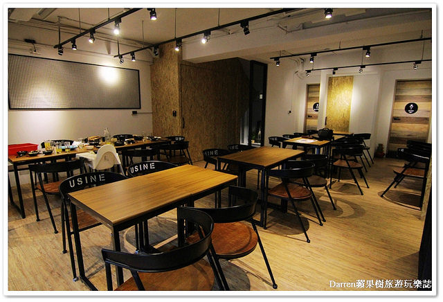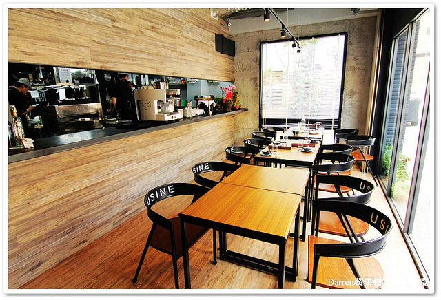 餐廳裡頭以木桌椅及木地板搭配略帶粗獷的水泥牆面,讓整體空間帶出輕工業風格的氛圍