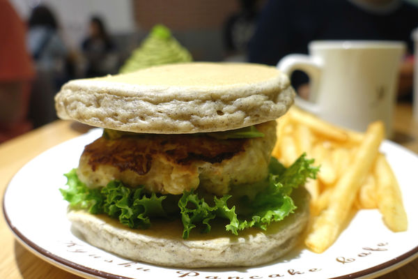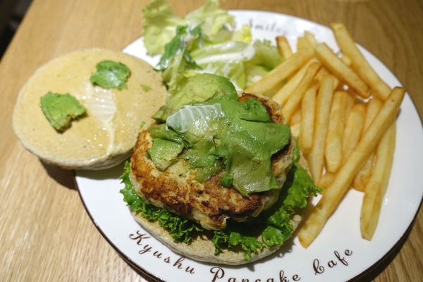 用九州鬆餅粉製成的餅皮取代傳統油亮的漢堡麵包,看起來很不賴