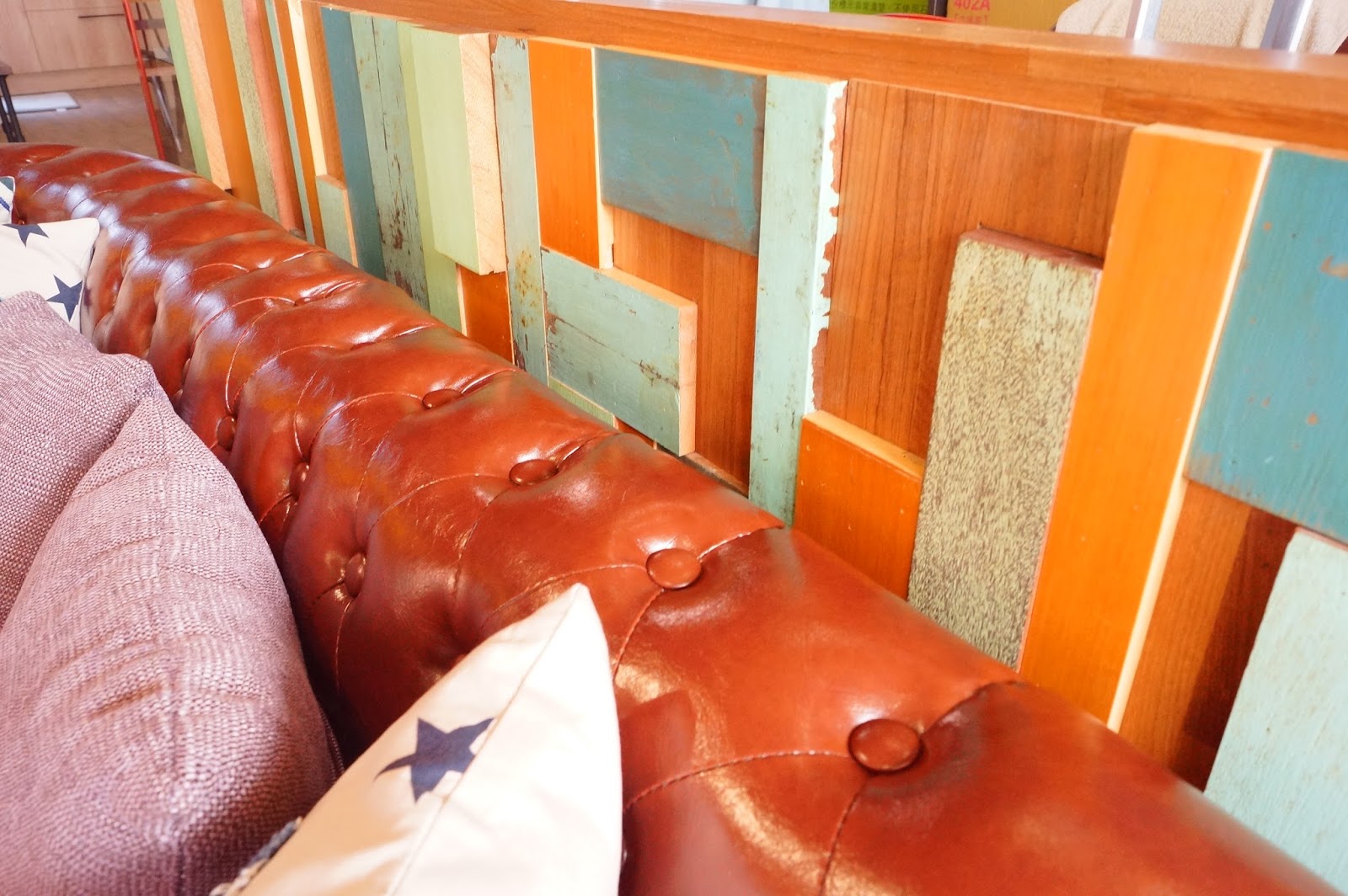 沙發椅後面的吧檯牆也很有故事,這些大小不一、顏色都不同的木塊,其實都是老闆家裡的木製老家具,以前的家具用料都很好,甚至有台灣檜木,都可以很耐久使用,其實這些都是台灣那個年代的回憶。