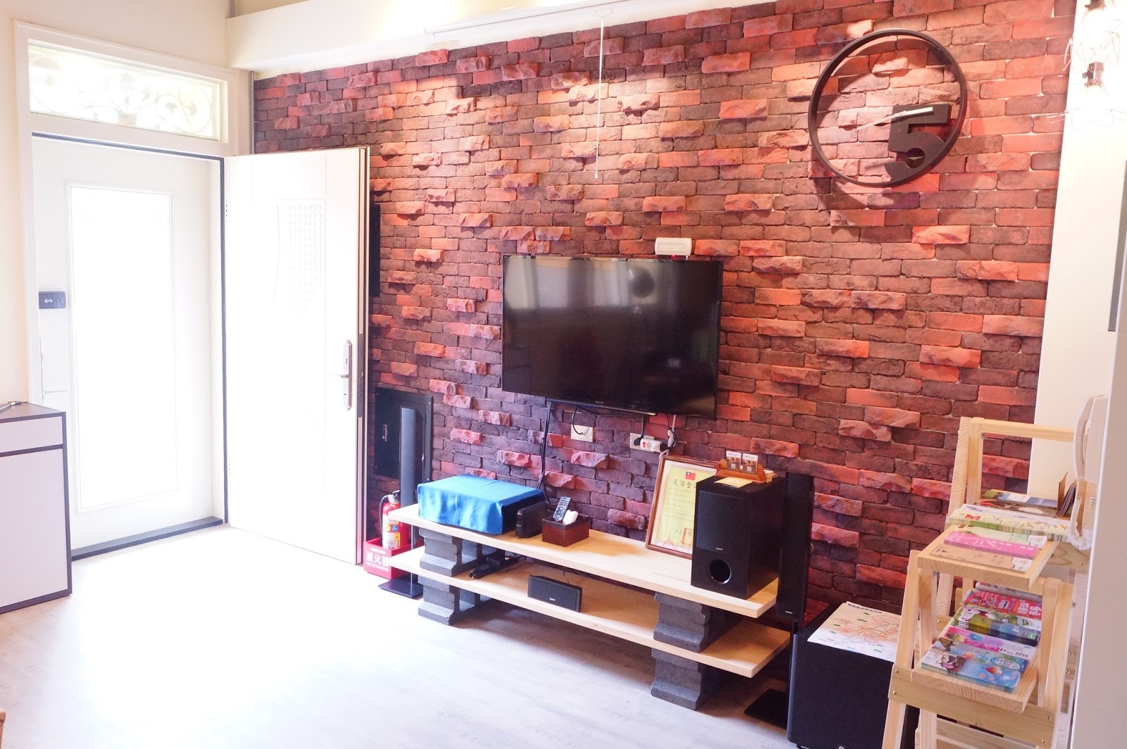 進入民宿,馬上就可以發現一大面的紅磚牆,這個可是老闆跟老闆娘兩人親手施工,把凹凸不平的磚一面給磨平後,在一塊一塊的黏上去,是很耗時費工的工作。