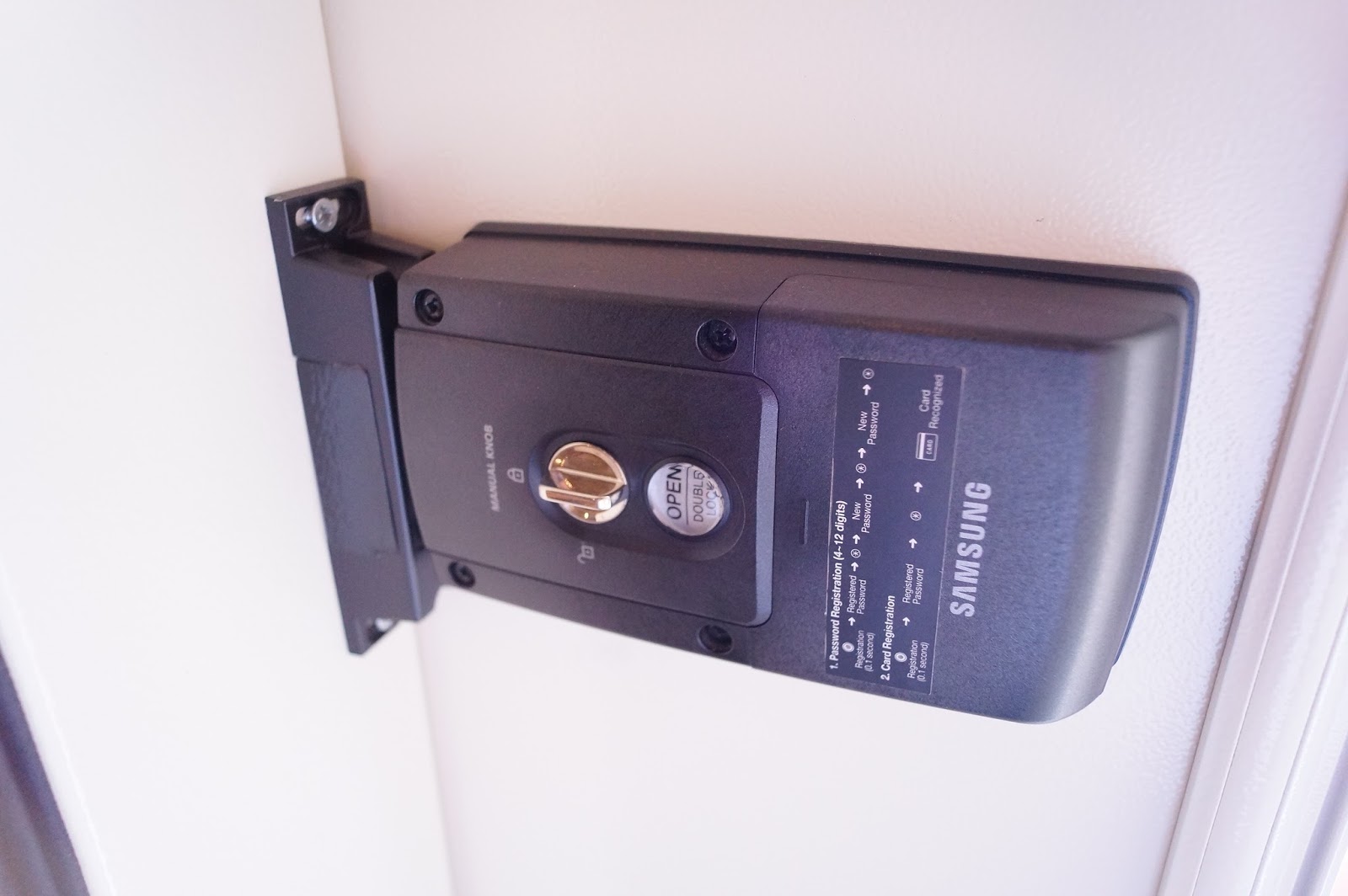 民宿的門是用三星的電子鎖,相較一般傳統鎖也安全許多,Check in 的時候民宿主人會告知密碼就可以自由進出了。