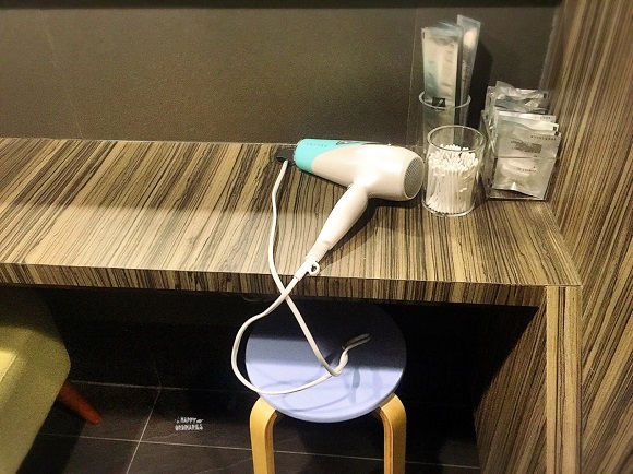 再來是全浴室裡面我最喜歡的角落 XD 你們看這個梳妝台,有浴帽、棉花棒、梳子,重點是這支吹風機是負離子的喔喔喔~如果你跟我一樣住五樓的話就一定要用這支吹喔~因為旁邊那幾隻都沒有負離子XD