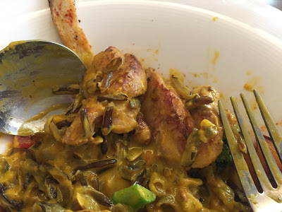 這道就是我點的農村南瓜醬雞肉黑野米,我特別把黑野米挖出來拍,因為它未免也長得太可愛了吧!是的你沒看錯,那個像木耳的小條狀物就是黑野米,不知道它的特性是不是煮了就會爆開(爆米花?)但就算爆開還是很有口感喔~我特愛它外面那層黑皮,口感有點類似紫米,裡面的白心則是有點像不會太黏的糯米,好好吃阿!我其實不喜歡吃米飯,比起米飯我更愛吃麵點或麵包,但是這個我整個一口接一口停不下來啊!