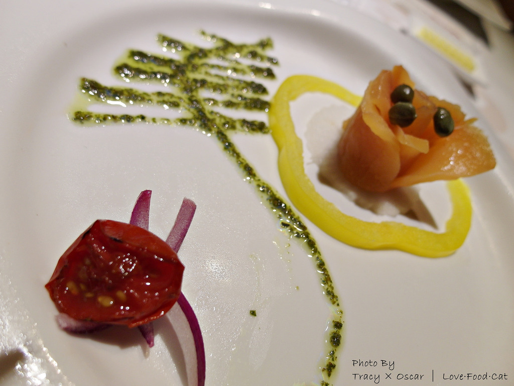 ↑前菜煙燻鮭魚佐松子青醬,軟嫩爽口的煙燻鮭魚,搭配以羅勒、大蒜等製成口味較重的松子青醬,