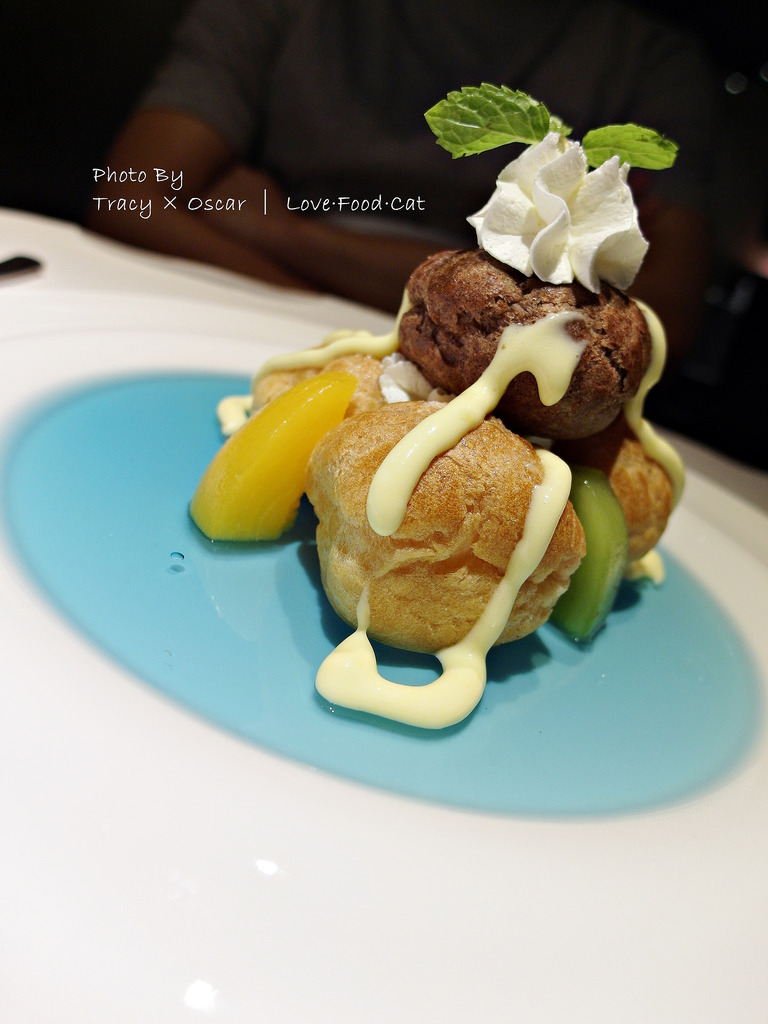 ↑卡士達泡芙塔,視覺效果非常可愛,底層水藍色是用洋甘菊做成的果凍,吃起來有點涼涼的,