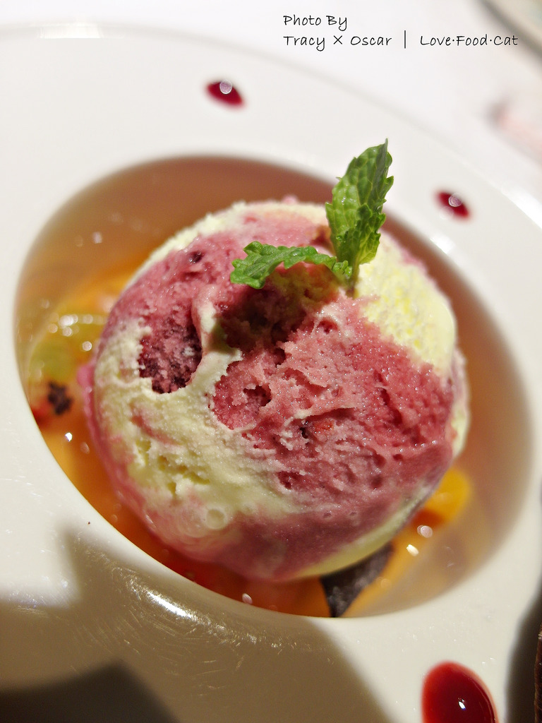 ↑野莓鮮果冰淇淋佐朱古力脆餅,野莓冰淇淋和香草冰淇淋混和後的顏色也好漂亮,