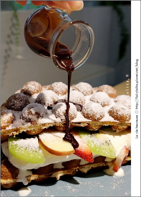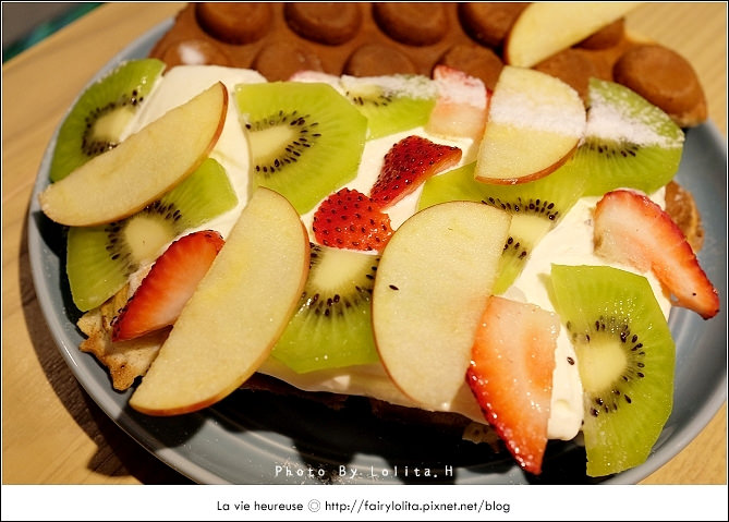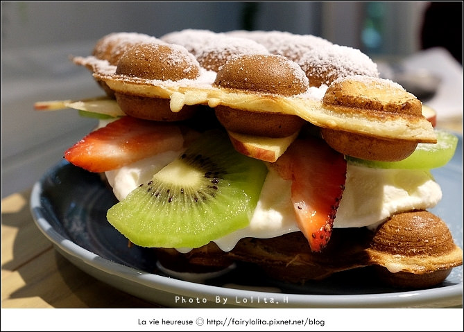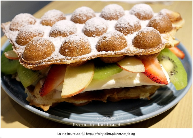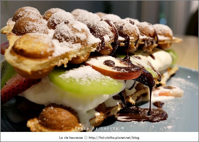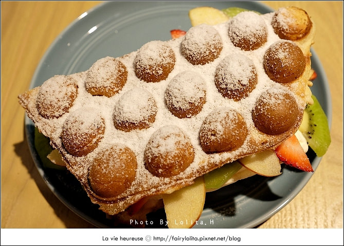 夾層中的水果五顏六色好繽紛,擺盤果然是REVEL的強項,中間還有香濃的香草冰淇淋,表層雞蛋仔酥酥脆脆有餅乾的口感,底層的雞蛋仔則是因沾附了冰淇淋而變得濕潤軟口,大口咬下完全就是三重滋味一次享受。