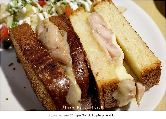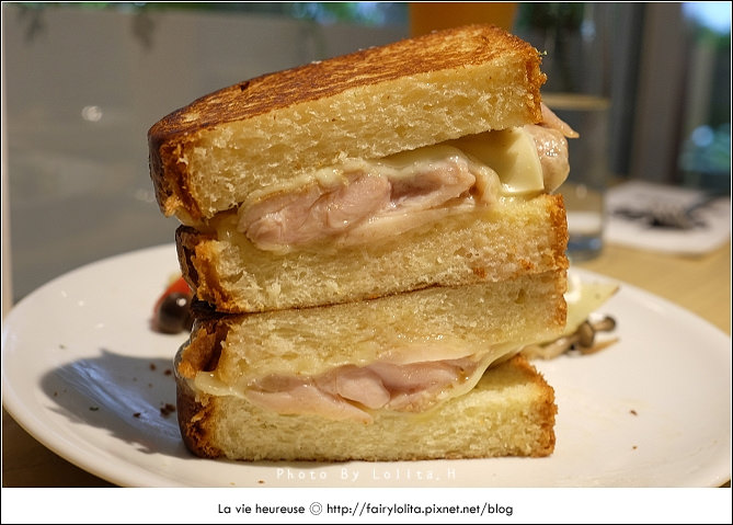 兩種起司的相互交融,在嘴裡稠黏又纏舌,簡直是濃郁到化不開,腿肉本身鹹度較高,而肉質卻是嫩到不像話,每一口都飽嘴又幸福,這種超犯規的三明治,不管是嘴巴還是視覺效果,都是高滿意度的過癮阿!超推~