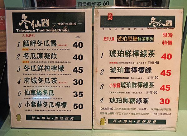 冬仙堂景美分店主打商品為奶茶系列;總店(萬華艋岬)則是主打冬瓜飲品,所以窗口擺了許多冬瓜系列產品