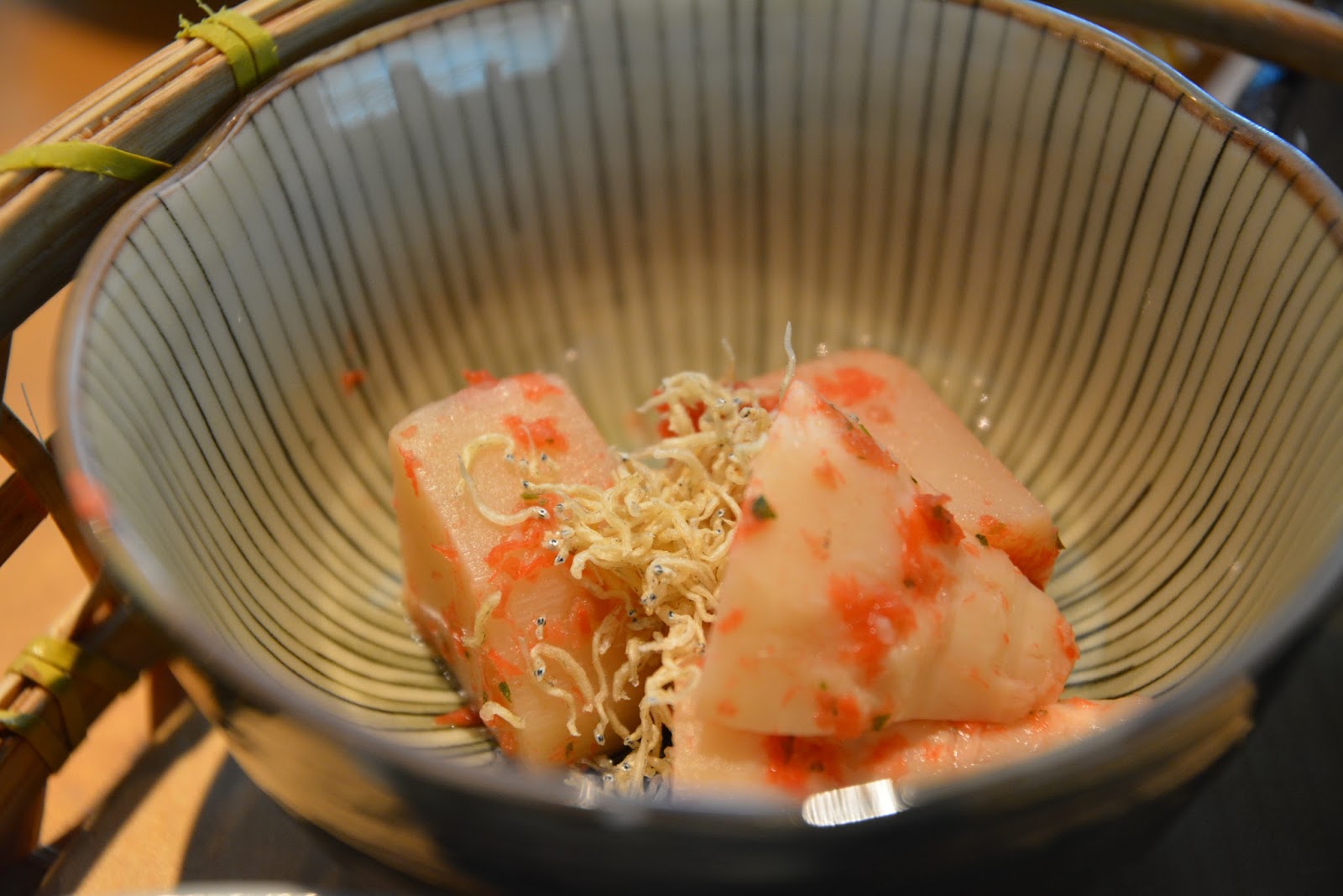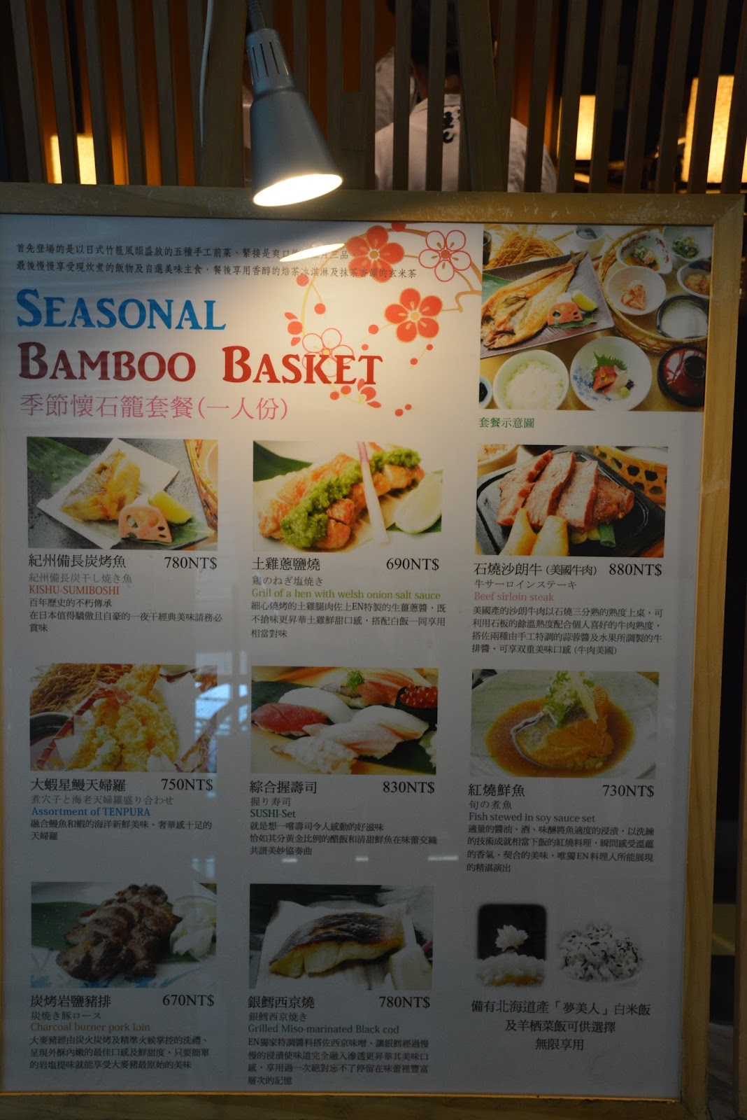早就想好要來試試這裡的季節懷石籠套餐,由竹簍裝著五道前菜與生魚片,再搭配上自選主菜及味噌湯,餐後還有甜點與煎茶,這樣的多樣化雅致和食著實吸引著我。菜單請點這裡
