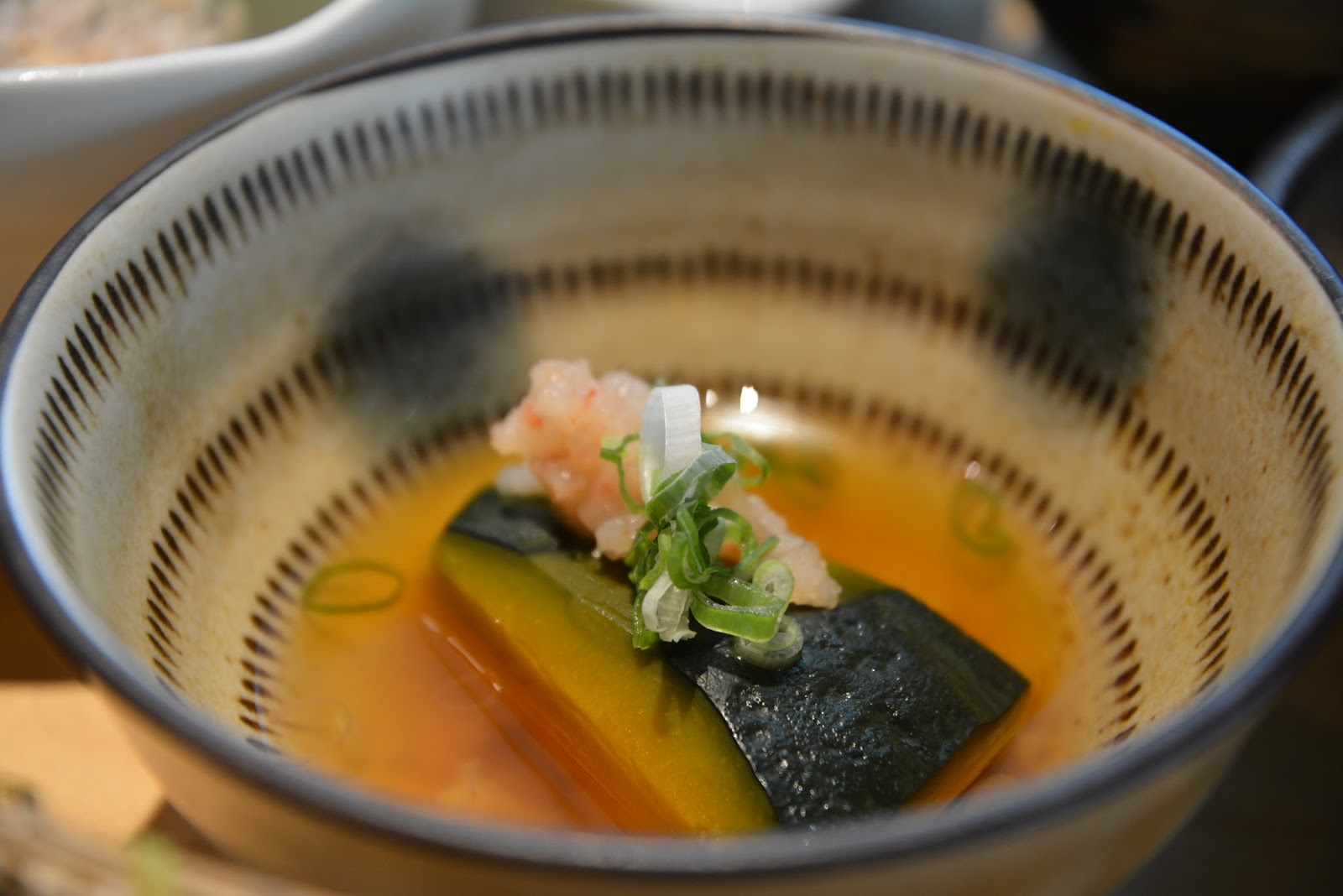 這份旨煮南瓜蝦仁羹煮得鬆軟甘甜,上面點綴著蝦仁細末與青蔥提鮮,讓平凡的南瓜吃起來格外鮮美。