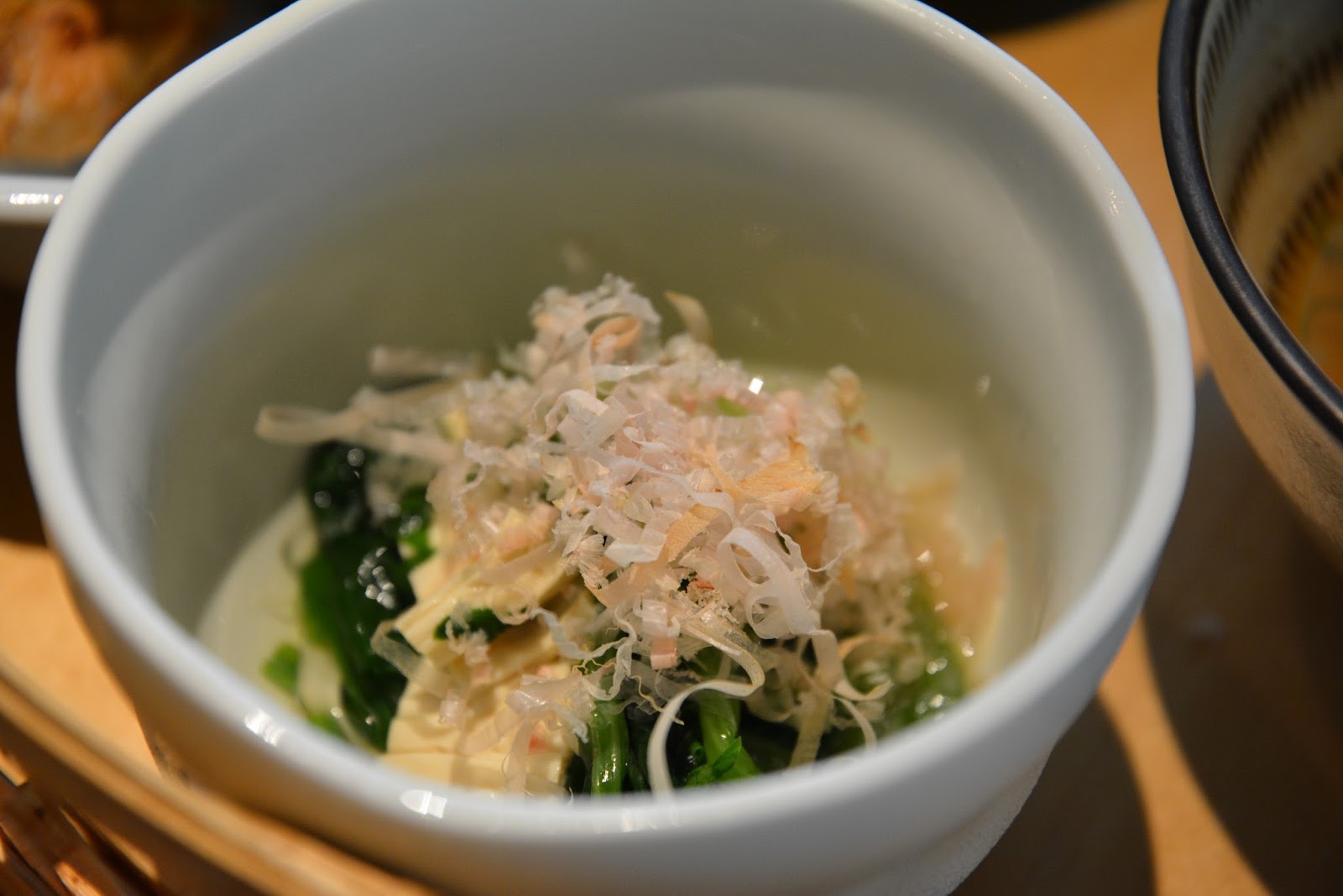 菠菜湯葉高湯漬是菠菜與新鮮嫩豆皮的涼菜,上面細緻的刨入柴魚片,成為了細緻又出色的一道冷菜!