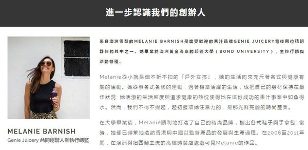 在官網記錄著創辦人是一位很陽光的女孩 - Melanie Barnish ,