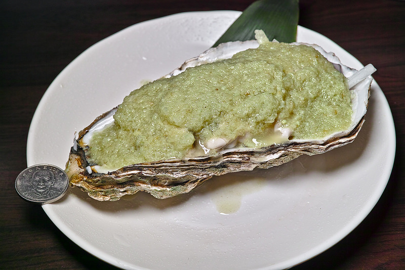 超大一顆, 上面是老闆的特調醬料, 酸甜可口, 而且不太會搶走這大生蠔的美味