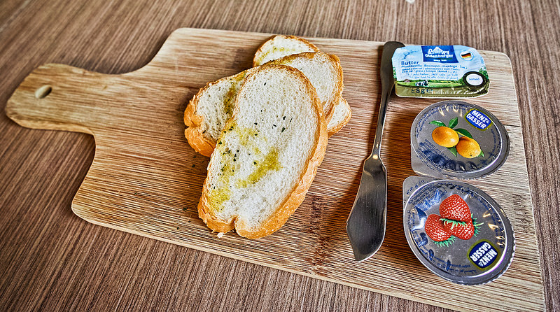 早午餐都附上三片烤好的法國麵包, 有兩種果醬與奶油可以搭配
