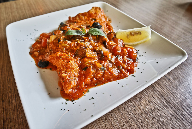 多利魚片裹粉煎炸, 蕃茄醬汁也好 ( 蕃茄、洋葸、紅椒、黑橄欖及很多蔬菜調成 )