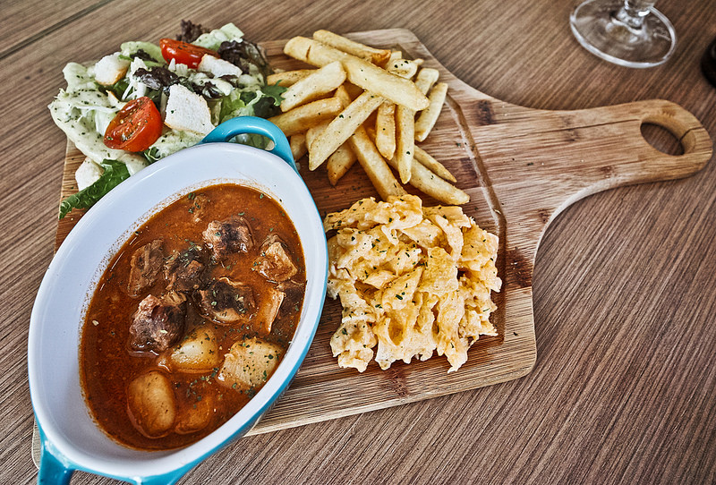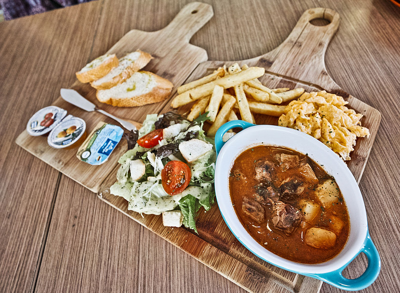 主體則是有沙拉, 薯條, 炒蛋和紅酒燉牛肉