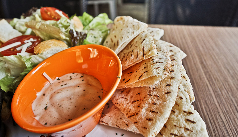 搭配的是pita 餅, 也可以把雞肉與彩椒放進去一起吃