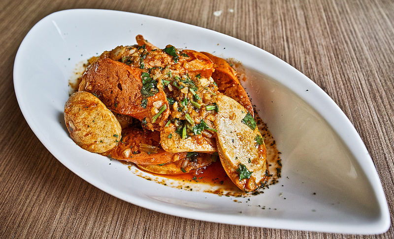 馬鈴薯為底, 配上橄欖油與胡椒, 章魚僅簡單燙過, 香滑可口, 再灑上些海鹽提味就很完美了