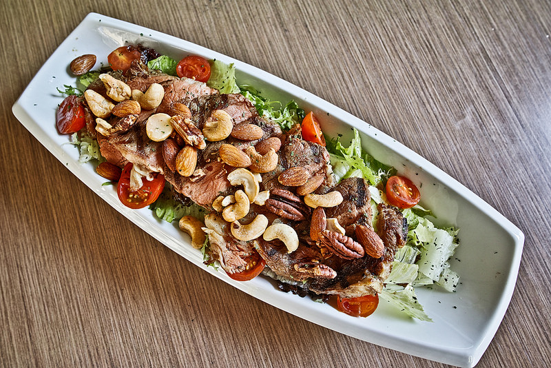 8 Oz 牛排煎好後以沙拉為底, 上面再灑上堅果