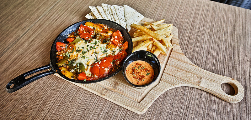 洋蔥、番茄、甜椒為主, 搭配如新鮮的巴西里和芫荽等香料, 底下有蛋, 搭配pita 餅和鷹嘴豆泥, 清爽又美味