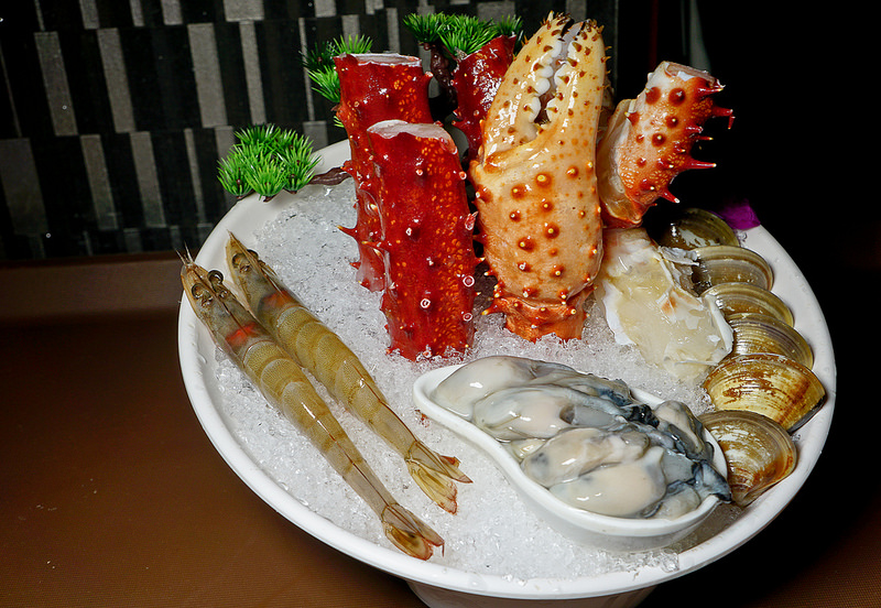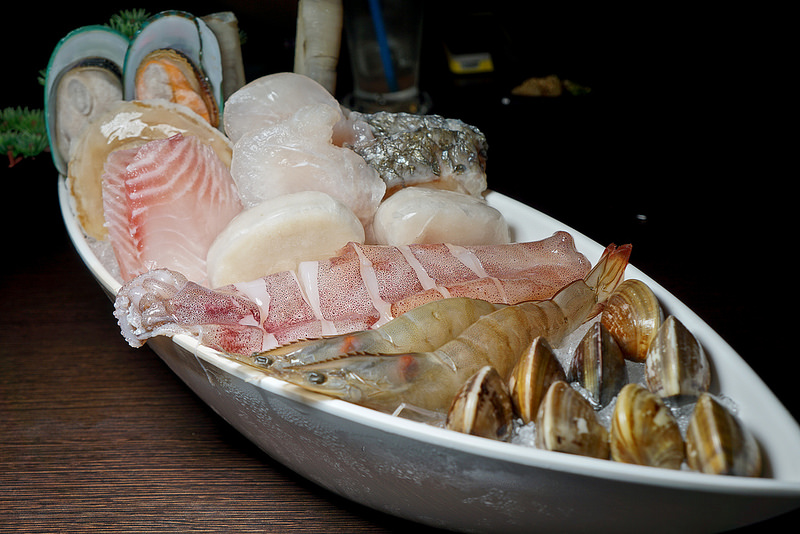 大蝦, 一整隻的軟絲, 蛤蜊, 干貝, 魚, 孔雀貝, 還有極少在台北吃到飽看到的竹蟶