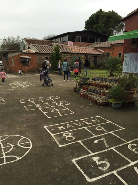 古早味濃厚的三合院,地上滿是小時候玩的跳格子