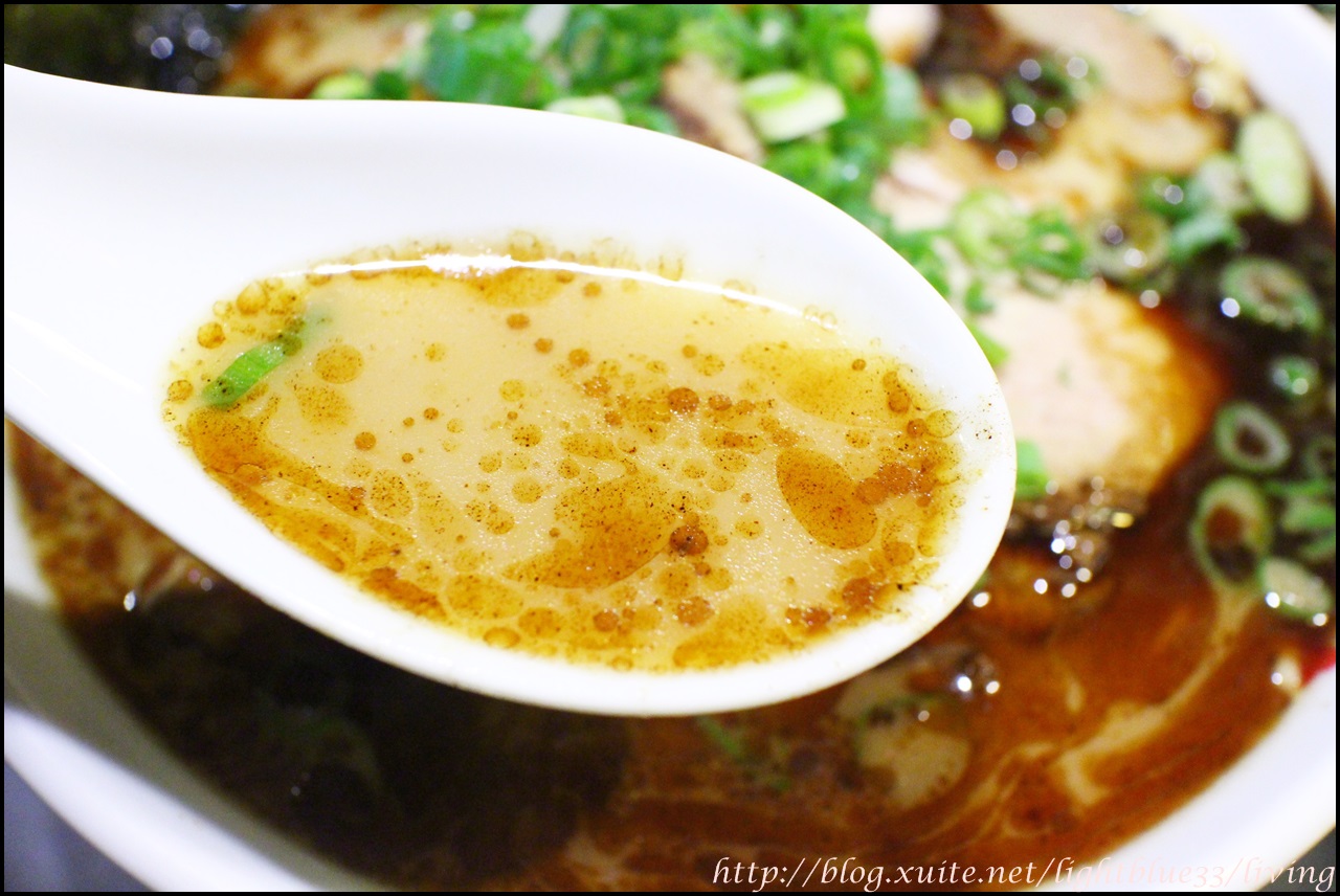 玩笑亭的拉麵是走熊本系,熊本系豚骨湯底的最大的特色就是白濁的豚骨湯以及使用蒜片爆香,玩笑亭的湯底便是由豚骨、雞骨加上羅布昆布熬至二十四小時而成,不過雖然味道濃醇強烈,卻沒有豚骨的腥臭味是一大特色,不過提醒大家這也要趁熱享用,因為豚骨湯底一放涼就比較容易在表面凝結。而黑色的便是爆香至焦黑的蒜油,使得豚骨湯底更多了一重風味