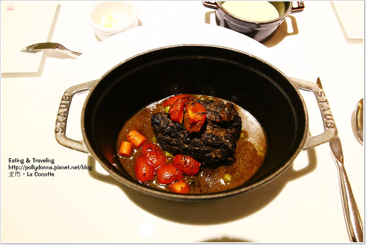 套餐的主餐只有一種為紅酒燉豬頰佐番茄二重奏與青豆馬鈴薯泥,是鑄鐵鍋料理。
