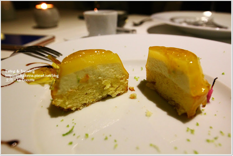 甜點的部分因為我不吃冰所以換成檸檬塔,因為慶生的緣故所以還有一根小蠟燭,上面的法文Bon Anniversaire是生日快樂的意思。