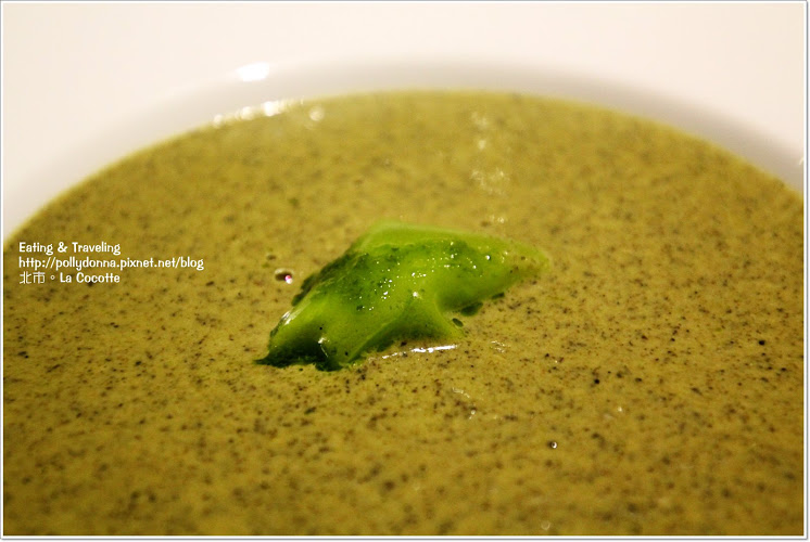 這個看起來綠綠的湯是三星蔥蔬菜濃湯佐伊比利豬背油,乍看之下我還以為是青醬,綠綠的色澤看起來不是很討喜,濃湯中是炒過的三星蔥+伊比利豬背油+巴西利做成凍狀,伊比利豬背油是伊比利豬背脊脂肪的部分,巴西利是一種常用來調味、提香的植物,濃湯則是淡淡的蔥香,完全不會有蔥的辛嗆味,是一道特別又好喝的湯品,而且是以往從沒嚐試過的味道,三星蔥是臺灣在地食材,用臺灣食材做成的法式料理,不論外國人或臺灣人我覺得都很值得嚐試。
