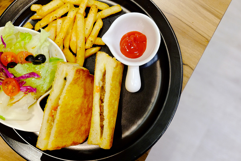 三明治看似貌不驚人,實則令人相當驚豔,咬下是熱熱酥酥脆脆卻不刮嘴,第一口就能嚐到打拋豬以及和麵包一體的起士,很開心三兩下解決。這兒的打拋豬微微的辣度,不嗜辣的人也可以嚐嚐這不常見的組合。附上的薯條炸的剛好酥脆,不蘸醬也很可口,搭配結球萵苣佐以芥末油醋的生菜沙拉很是爽口。