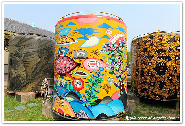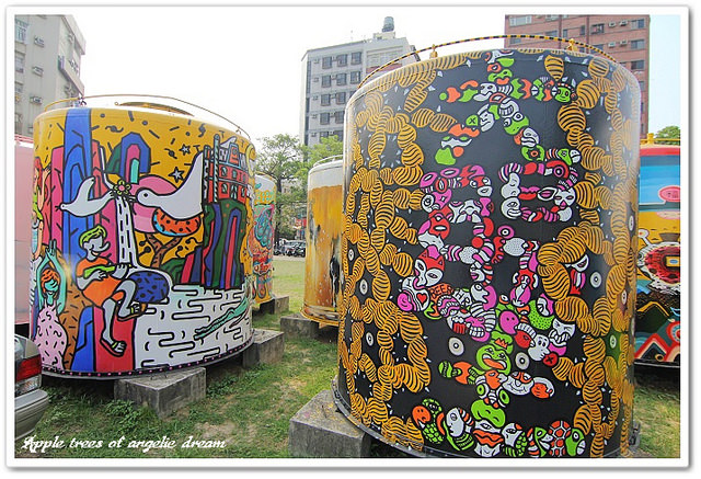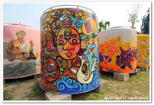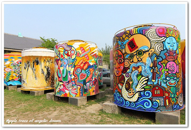 20個彩繪酒桶就在文創園區停車場旁邊,整片綠地搭配彩繪超級引人注目